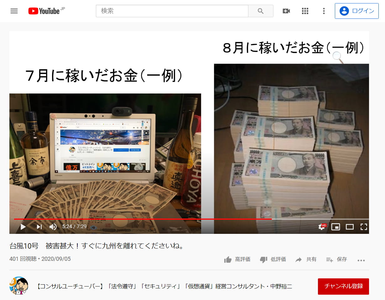 中野氏は2020年09月05日投稿の『台風10号 被害甚大!すぐに九州を離れてくださいね。 - YouTube』( https://www.youtube.com/watch?v=mumMN5VBQ1M )にて2020年08月のトレード収益として一億円分の札束の写真を公開しました。しかしこの一億円写真は少なくとも2020年03月にはインターネット上で公開されています。つまり中野氏は一億円の利益を上げていません。虚偽を含む宣伝活動をして顧客を募る行為は詐欺に当たります。