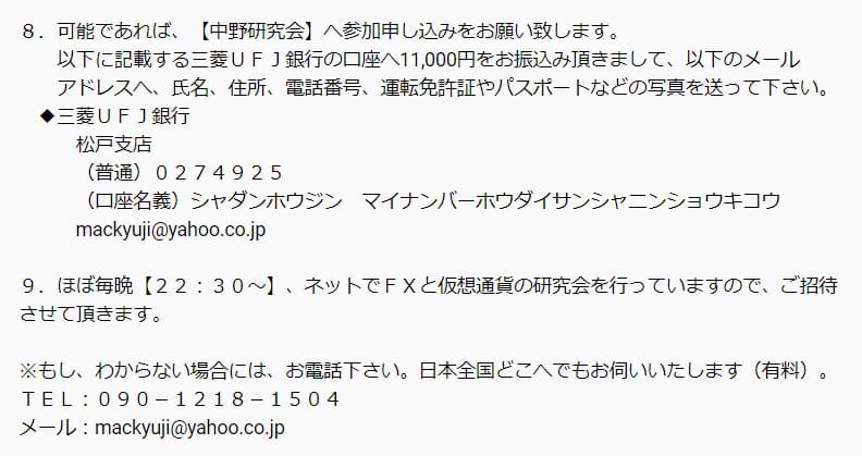 札束の写真(インターネット上に公開済み)を流用して勧誘を行う中野裕二氏